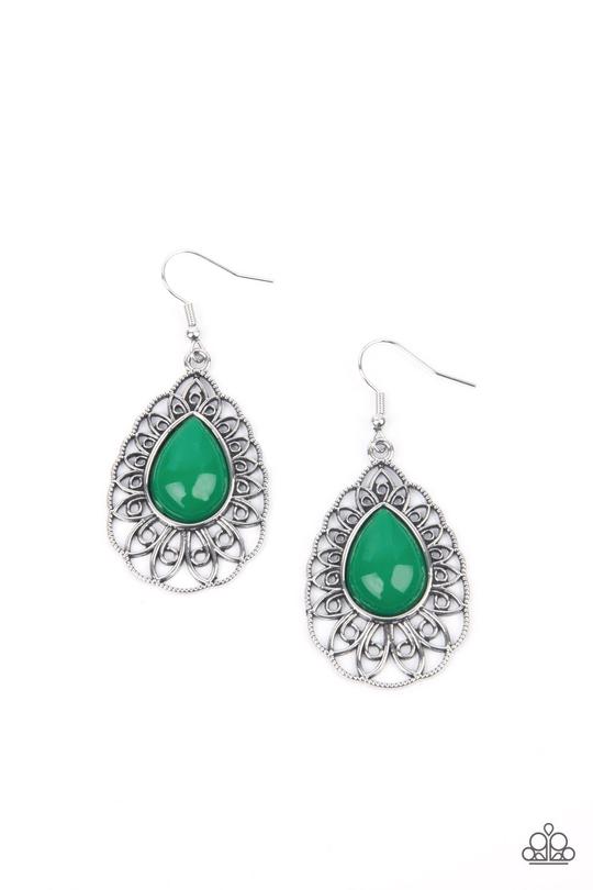 Dream STAYCATION - Green Beaded Silver Teardrop Frame Paparazzi Earrings