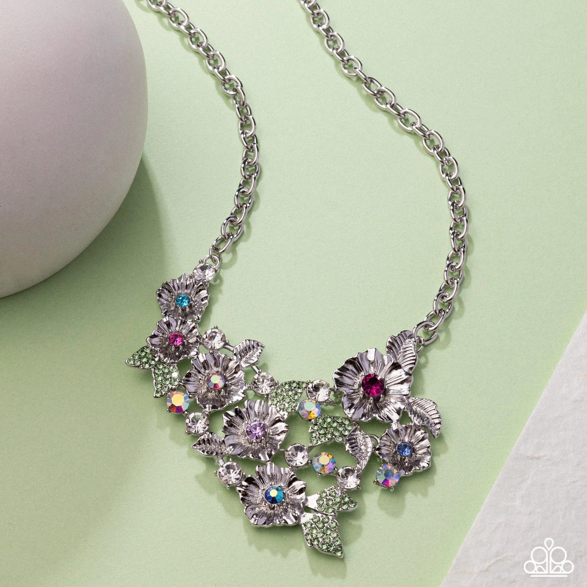 Shimmery multicolored and multicolored iridescent rhinestones in varying sizes dot and create the centerpieces of shimmery luminescent silver flower centerpieces beside textured and green rhinestone-dotted silver leaves and solitaire white gems for dizzying, intricate detail. The flourish of florals is whimsically gathered below the neckline from a silver cable chain, resulting in an unforgettable statement piece that sparkles with sentiment. Features an adjustable clasp closure. Due to its prismatic palette, color may vary.