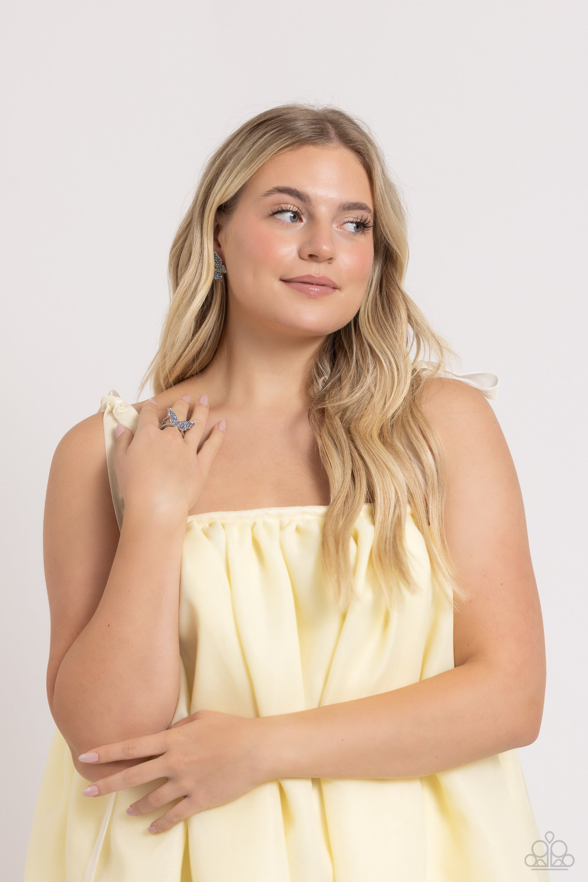 High Time - Blue Iridescent Rhinestone Encrusted Butterfly Paparazzi Post Earrings