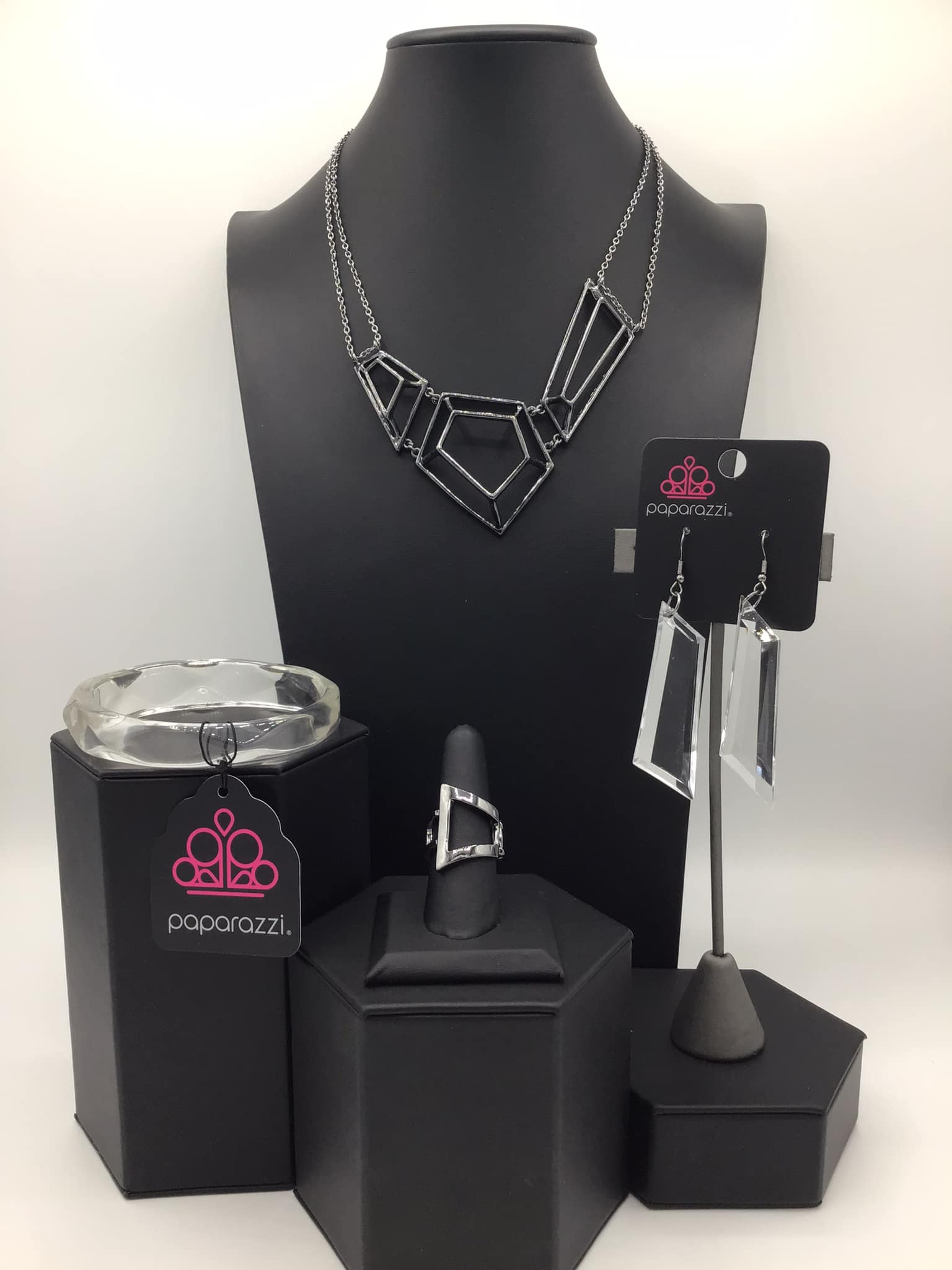 Necklace: "3-D Drama" - Glistening gunmetal bars connect into edgy 3-dimensional frames below the collar, creating a bold geometric statement piece. Features an adjustable clasp closure.